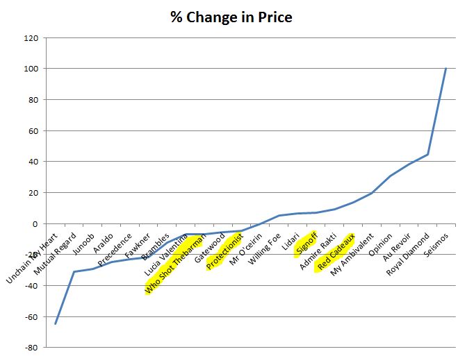 Whilst on the subject of multis, here's another approach. Look at % change in Back price since the Open. The graph shows the plus or minus change in price for each runner. The first four placing's never had a plus/minus change in price above 15%. Debatable though, whether the payoff (positive) was as cost effective as simpler methods?