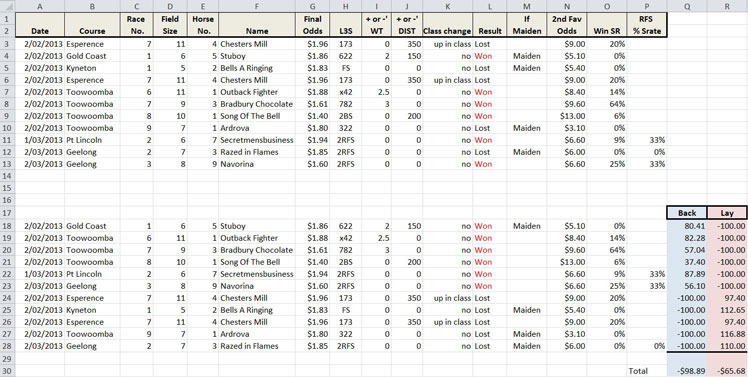 Firstly you need to gather at least 300 race results that included a horse within your price range. You can source all this information from Betfair & Racing & Sports, I have attached an excel spreadsheet view to guide you. The data you'll need: