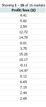 Are you able to shed some light on the following? 1. What makes this particular angle on punting the best possible match for you, your own personal style and preferences etc ? I ask this because I have observed you searching for a 'grail' of a kind in other aspects, seemingly without much success (although I could be wrong). 2. Is this actually 'punting', or are you demonstrating the skills and attributes required for trading a market.. any market? 3. What can we learn from your successful trading endeavours e.g. find a niche and exploit it, look where few others are looking, target your own personal requirements for making additional disposable income first and then find an opportunity that consistently yields the required results, find a way to way to build an ark of wedge, one plank-profit at a time and sail the family around the world in it for an entire year ???* Apologies for being so anal with regards my queries and somewhat theatrical with my suggestions here.. your detailed results and ample evidence for a successful strategy make me inquisitive to the bone, and keen to derive what lessons I can in this respect! Cheers LG * Beats buying a new lawnmower or lilly white washing machine?
