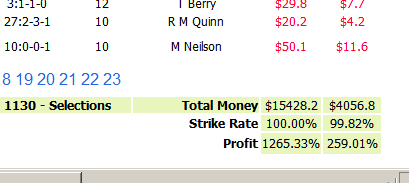 don't know if he has a problem with his algorithm or not, but I can check my results on black and white, ie. look back on the race and horses and check manually. Still if it works good luck, would be careful to check it out before parting with the dosh though! Cheers |