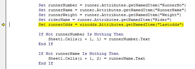 Set runnerList = xmldoc.selectNodes("//Runner") Sheet1.Cells.Clear For i = 0 To (runnerList.Length - 1) Set runner = runnerList.Item(i) I'd have to fiddle with the code later on as about to go to work. But i'd suggest its this section that also needs to be fiddled with to account for the Winodds addition. |