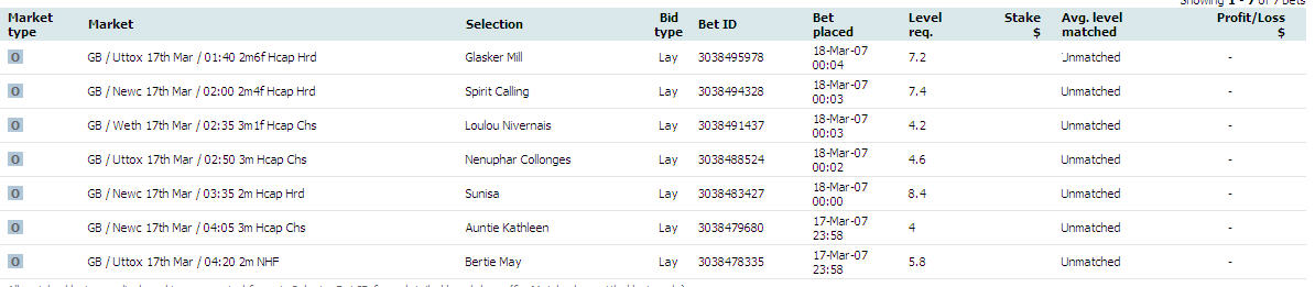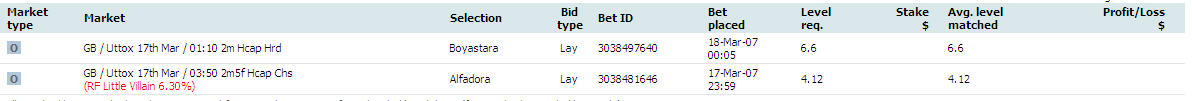 Last night provided a good example of the benefits offered by laying to prices. I'd priced the four selection like this Real Chief $7.00 Cool Roxy $3.75 Whyso Mayo $3.70 Quid Pro Quo $5.10 I couldn't get matched on Real Chief or Cool Roxy so I finished with two lays for two successful results. ![]() Date-Time Course - Name 20070316-0150 Fakenham - Real Chief ... LOST +1.00 20070316-0230 Fakenham - Cool Roxy ... WON -3.00 20070316-0300 Cheltenham - Whyso Mayo ... LOST +1.00 20070316-0315 Fakenham - Quid Pro Quo ... LOST +1.00 === RESULTS: March 6th - March 16th Pixie: === Number of Selections: 62 Successful Selections: 54 Strike Rate: 87.09% Profit: +18.67 units Commission @ 5%: -2.70 units Net Profit: +15.97 units Net POT: 25.75% Daily Donkey: === Number of Selections: 322 Successful Selections: 243 Strike Rate: 75.46% Profit: +12.91 units Commission @ 5%: -12.15 units Net Profit: +0.76 units Net POT: 0.23%