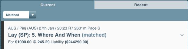 Attached is a SP bet placed on 'Where And When' the other night. It was for $1000 liability. You'll note that the confirmed bet displays that my liability if the horse wins, is $244,290! What the.....?? I raised it with them some time ago and their response was: "Our Technical team have discovered that the issue is a bona fide 'bug'. Whenever someone places an SP lay bet with an odds limit, the liability will be mis-reported as though it was the profit of a back bet. They've also advised that internally, the bet is processed correctly, so I can assure you that the intended liability is the actual liability and all bets will be settled correctly. The error has been escalated onto our mobile development team and will be fixed in a future release." |