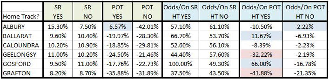Well I took a little over two years results and randomly picked a handful of tracks. The results are interesting: Sometimes the Home track improves Strike Rate, but not POT e.g. Geelong Synthetic Sometimes the Home Track is of no advantage, from a Strike Rate point of view, but POT improves e.g. Ballarat, Caloundra & Gosford Sometimes The Home track improves the Strike Rate and POT e.g Albury Then I applied a price filter, and only considered odds/on selections. That places a different dynamic on the whole thing, and drives home the point that there is a reason that every horse wins or loses, just a matter of finding which combination of filters? |