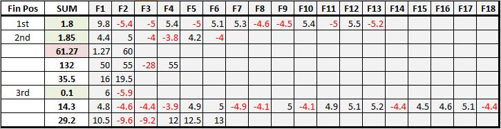 Might be, but check this out. Notice anything about the Sum of the first 3 placegetters compared to the rest? All these sorts of things are building blocks that might not work stand alone, but combined with a few others might build you a successful system/method. So take off the blinkers and look around where no one else is looking. ![]() |